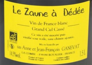 Le Zaune a Dedee更是Jean-Francois Ganevat展現過人天賦的創意大作,侏羅產區的特色品種Savagnin,幾乎可以確定就是原生北義的Traminer,因此也有人稱之為Traminer du Jura,在法國北部的阿爾薩斯,有更為知名的變種Gewurztraminer,Jean-Francois Ganevat嘗試將這兩種Traminer混釀再一起的原因,是因為他有一個摯友(匿名稱之為Mr. Dedee)在阿爾薩斯的Riquewihr擁有非常好的葡萄園,一樣採用生物動力法種植多年,為了讓風格較為輕柔的Gewurztraminer能和Savagnin完美的混調再一起,Fan-Fan決定使用泡皮釀造法(即橘酒orange wine的釀法),將Gewurztraminer整串進行長時間發酵泡皮,再與來自他自己土地的Savagnin混釀,經過數年以上的酒花之下的不添桶培醞(sous voile)而成,有趣的是背標以諷刺世俗追捧列級酒莊(Grand Cru Classé)地標示著“Grand Cul Cassé(破碎的大屁股)”。天分加創意,天馬行空卻又是具有邏輯,無怪乎能又創造出一款令人醉心不以的代表性巨作。