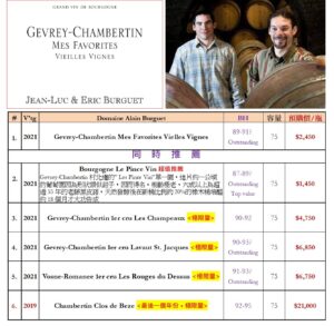 『…漸漸發現在沒有或僅有一些grand cru或知名1er Cru的酒莊,反而可以找到釀得非常好的村莊級酒…. Gevrey-Chambertin的Alain Burguet的Mes Favorites更可以讓許多一級園或甚至grand cru顏面無光』