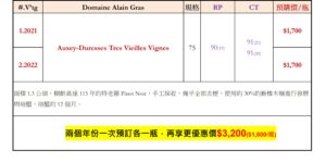 開瓶獻上來自Domaine Alain Gras的Auxey-Duresses Tres Vieilles Vignes 2021和2022,輕鬆價格一嘗百年老藤的迷人魅力,數量相當有限,敬請參考並把握預購良機!