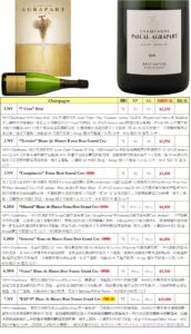 最後,這款非常特別且極為珍貴稀有的「EXP(Experience) Blanc de Blancs Grand Cru」,呈現葡萄天然風味的創新香檳,一般香檳在裝瓶進行第二次發酵時都必須添加”liqueur de tirage”,這是由葡萄酒加入糖和酵母的補充液,已進行瓶中的二次發酵以產生綿密的氣泡(這個階段稱之為”prise de mousse”),Pascal Agrapart經過反覆的實驗,一改添加”liqueur de tirage”而是加入下一個年份剛採收榨完的葡萄汁,由於果糖和酵母(附在葡萄皮)都是天然的,不但忠於風土的原味,更釀造出含有無比細稠綿密的氣泡質感,造就了「EXP(Experience) Blanc de Blancs Grand Cru」這款當今獨一無二且美味妙不可言的超頂級香檳,無怪乎酒評權威Antonio Galloni 都要盛讚道:『One of the most singular, unique Champagnes I have tasted in a very long time』。