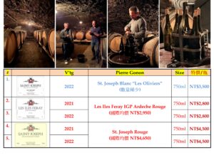 - Saint-Joseph Blanc Les Oliviers:Marsanne與Roussanne混釀,豐富的果香與高調酸度,來自黏土礫石土壤。